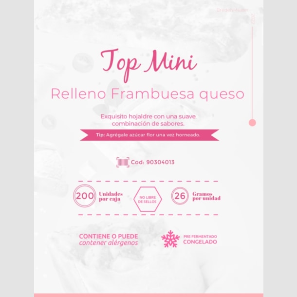 Caja Top Mini Relleno Frambuesa Queso - congelado. 200 unidades por caja. 26 gramos por unidad.